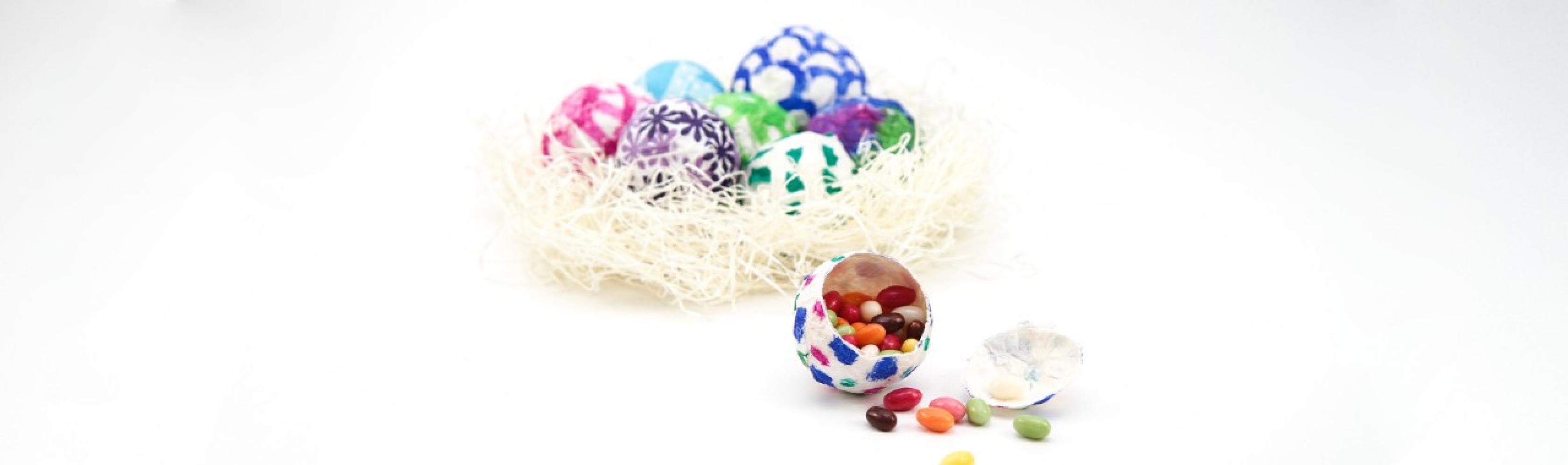 - Eine etwas grössere Öffnung ins Ei scheiden, um es mit Zucker- oder Schokoeiern zu füllen (Füllung kann selbst bestimmt werden). Die Öffnung mit etwas Klebeband verschliessen und mit Kleister und Seidenpapier vervollständigen.