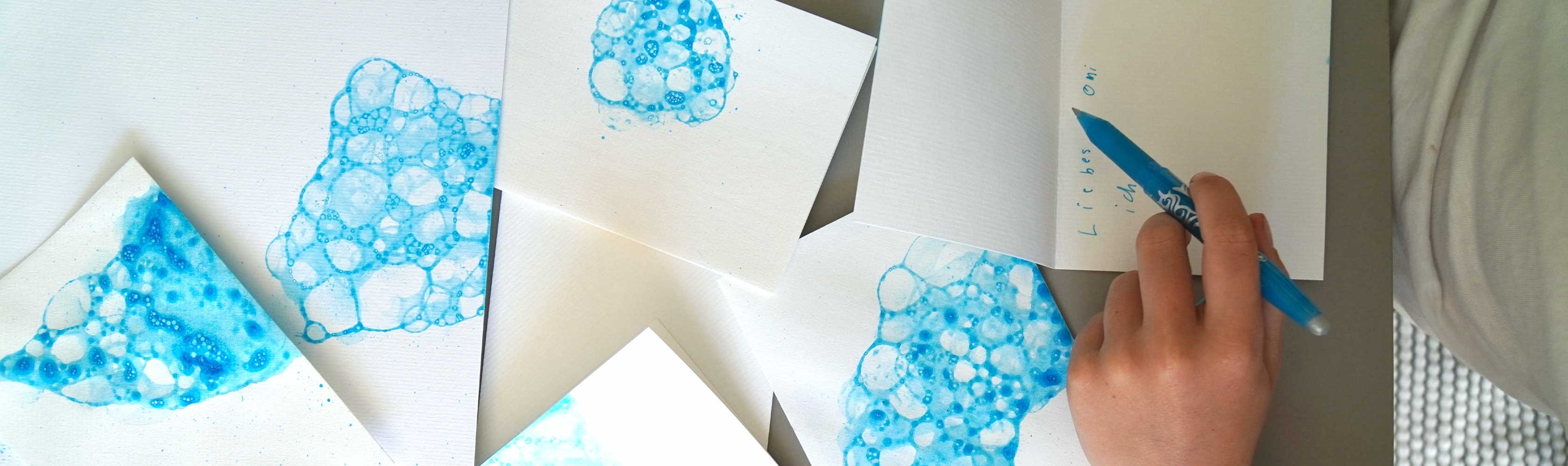 Malen mit Pinsel, zeichnen mit Farbstiften, skizzieren mit Bleistift. Alles schon zigmal gemacht. Schon mal gehört, dass man mit Seifenblasen Papier färben kann? Es ist ganz einfach und das Resultat sind wahre Kunstwerke. Ob bunt oder ganz zart – ob Einladungskarte, Bild, Geschenkpapier oder Brief bestimmst du.