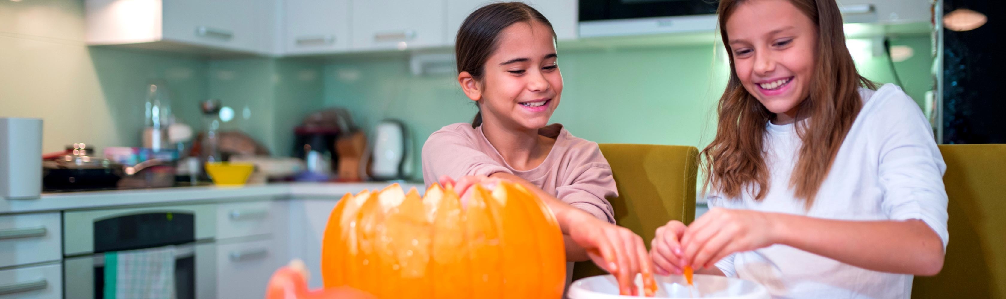 Conci-Blog Oktober-19 - Zwei Mädchen sitzen in der Küche, basteln zusammen an einem Kürbis und lachen.