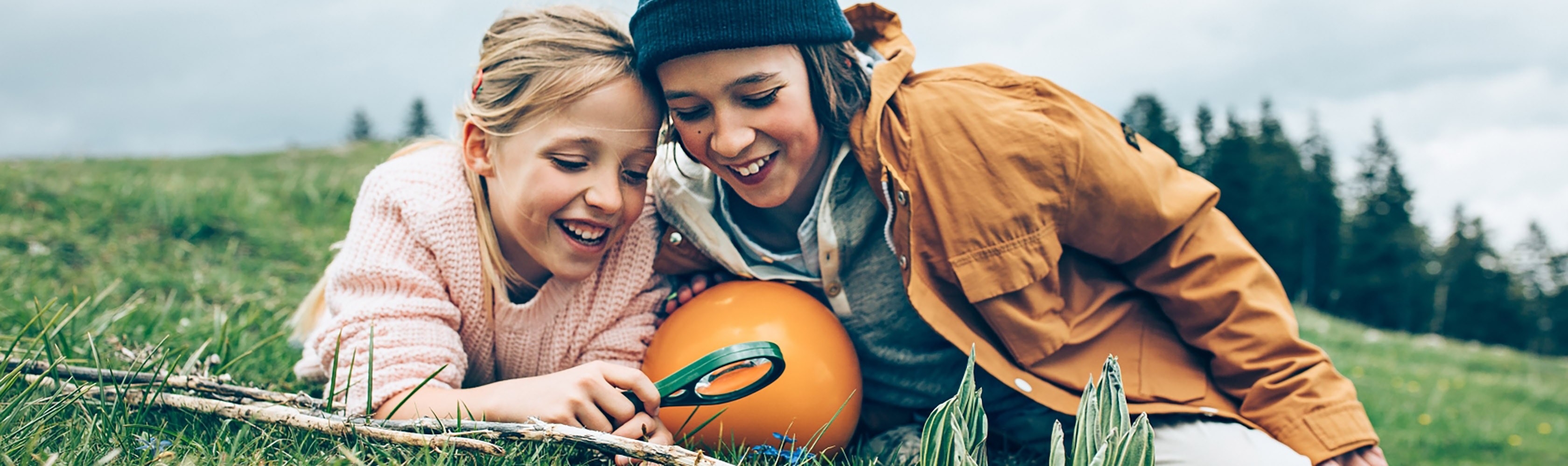 Vater und Tochter untersuchen mit einer Lupe eine Blume.