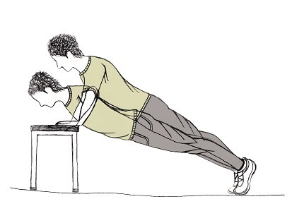 Vereinfachte Übung: Hände auf der Banklehne abstützen. Acht Wiederholungen, von Training zu Training bis zu sechzehn Wiederholungen steigern.