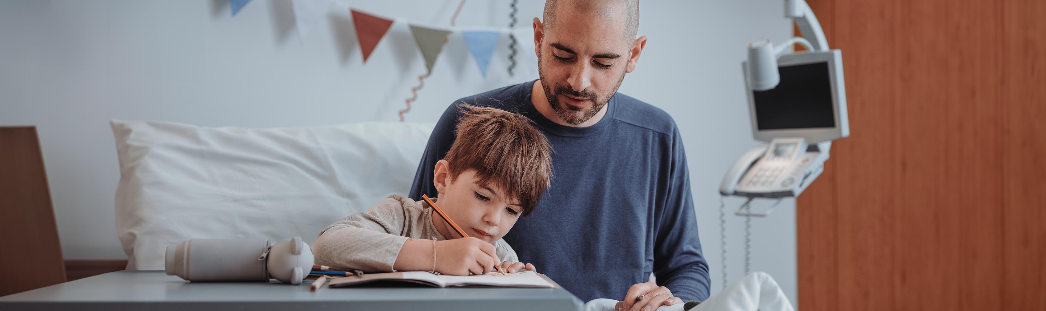 Knabe sitzt auf einem Stein und liest ein Buch. Im Hintergrund steht ein Mädchen mit einem organgen Ball.
