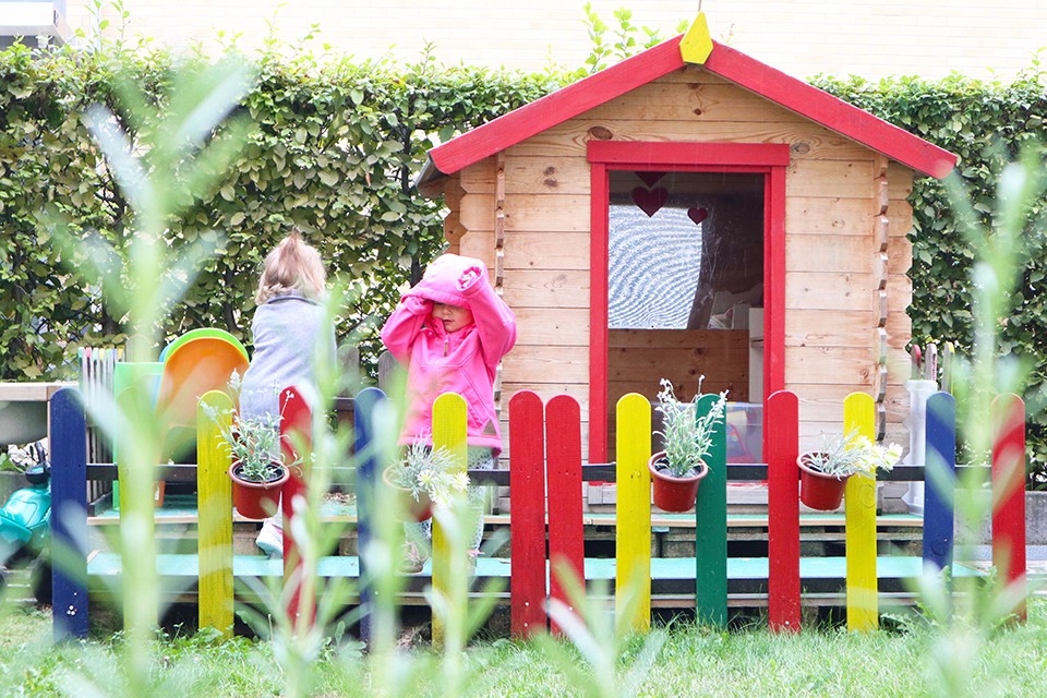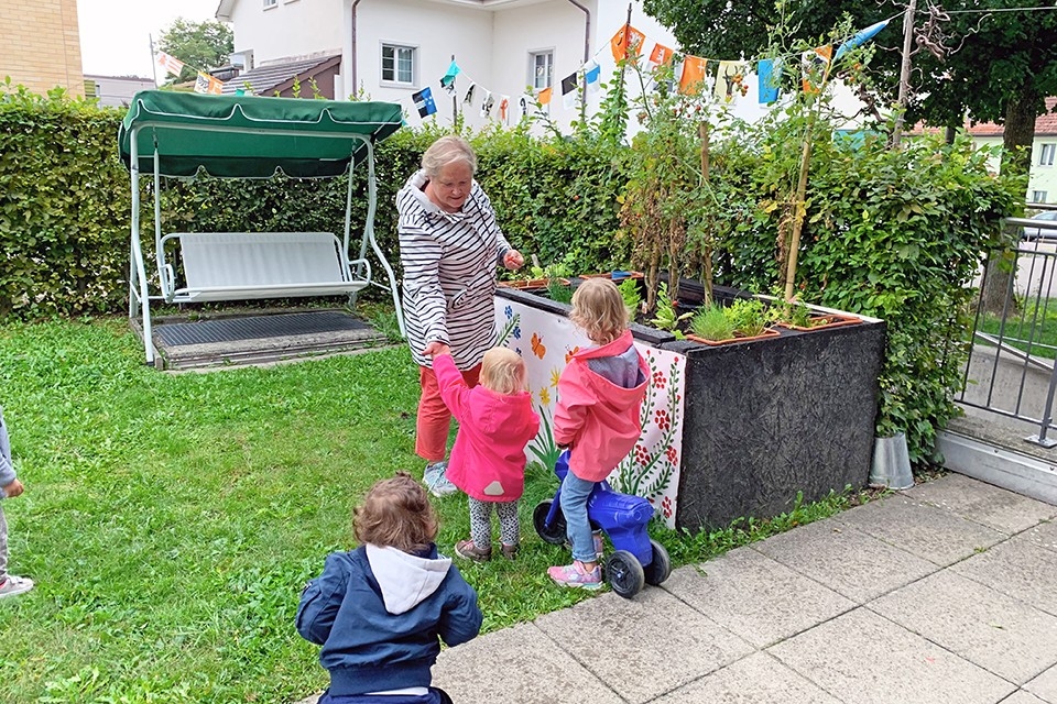 Im Garten drehen die Kinder ihre Runden im Karussell. Plötzlich beginnt es zu regnen. Flink ziehen die Betreuerinnen jedem Kind seine Regenjacke an. Auch wenn der Regen den meisten Kindern nichts ausmacht. Als der Regen zu stark wird, flüchten alle auf die überdachte Terrasse. Schnell findet man ein Überbrückungs-Programm. Die Kinder und ihre Betreuerinnen sitzen im Kreis und singen ein Lied. Dazu klopfen sie mit ihren Händen auf die Schenkel und machen das Geräusch galoppierender Pferde nach, ein paar der Kinder hüpfen im Takt mit. Währenddessen hilft die Seniorin drinnen bei den Mittagsvorbereitungen und füttert zwischendurch ein Baby. «Es ist wie eine Familie hier», erzählt sie mit einem Lächeln. «Ich war selbst einmal Kleinkinderzieherin und nun bin ich wieder in der KITA! Ich habe hier meinen Plausch mit den Betreuerinnen und mit den Kindern und fühle mich gut aufgehoben. Ich kann mithelfen, wenn ich möchte, muss es aber nicht. Der Alltag ist die beste Therapie!»