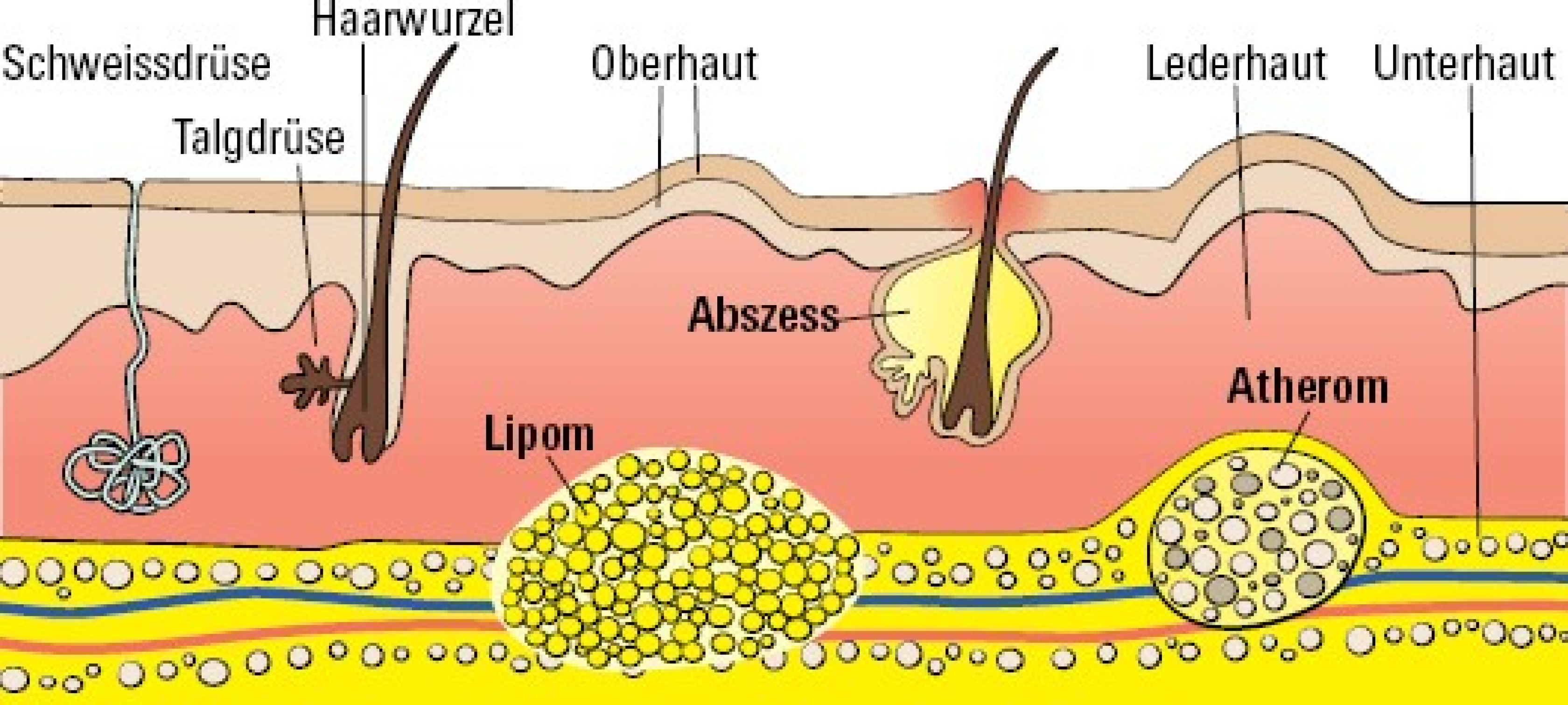 Atherome (auch Talgzysten genannt) und Lipome sind gutartige Knoten, die unter der Haut liegen. Das Atherom ist eine sogenannte Zyste. Das heisst, ein Häutchen trennt das Gebilde vom sonstigen Gewebe, hat es quasi fest verkapselt. Diese Zyste ist mit Fetttropfen, Fettkristallen und Hautzellen gefüllt. Das Lipom hingegen besteht lediglich aus einer Ansammlung von Fettzellen. Die prall elastischen Atherome finden sich besonders an Kopf, Nacken und Hodensack; die meist kugeligen Lipome kommen am ganzen Körper vor.