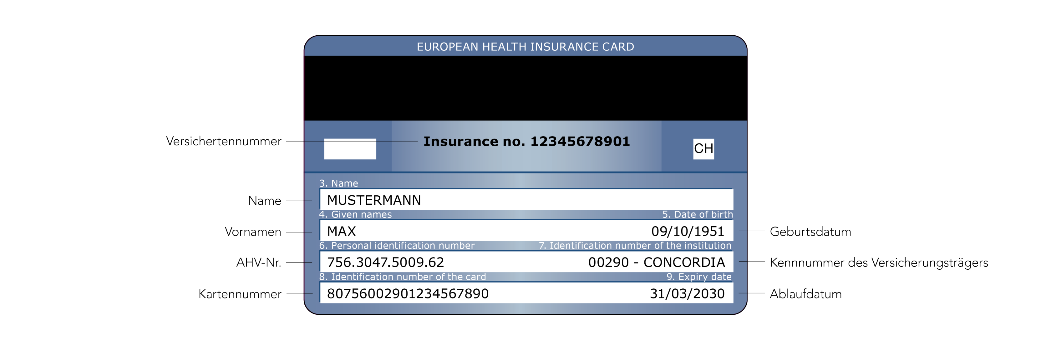 Wenn Sie bei der CONCORDIA die obligatorische Krankenpflegeversicherung (OKP) abgeschlossen haben, befindet sich auf der Rückseite Ihrer Krankenversicherungskarte die Europäische Krankenversicherungskarte mit folgenden Angaben: