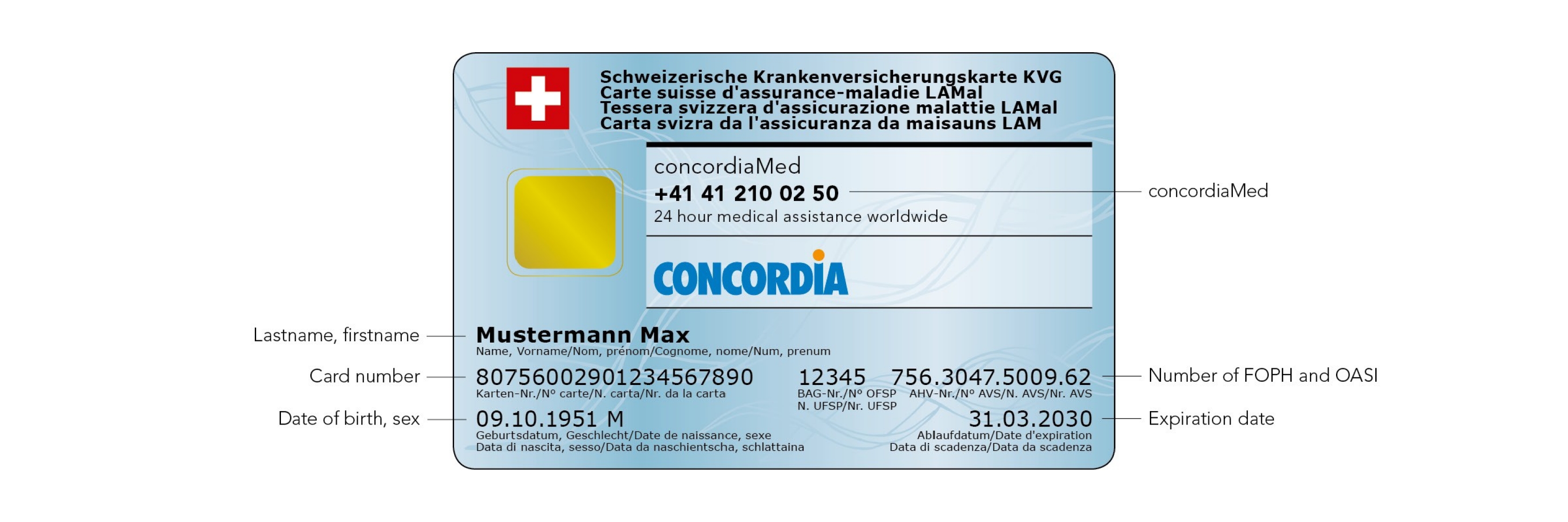 The legal provisions concerning the Swiss health insurance card pursuant to the Swiss federal law on health insurance (KVG/LAMal) are regulated in Art. 42 of the KVG/LAMal and in the ordinance on the insurance card for obligatory health care insurance (VVK/OCA/ OTeA). In accordance with the VVK/OCA/OTeA, you are obligated to show the insurance card when drawing benefits in the health care system. With your verbal consent, all benefit providers that have been authorised by the VVK/OCA/OTeA may retrieve the following data online for the purpose of issuing an invoice. In accordance with the VVK/OCA/OTeA, CONCORDIA shows the following data:
