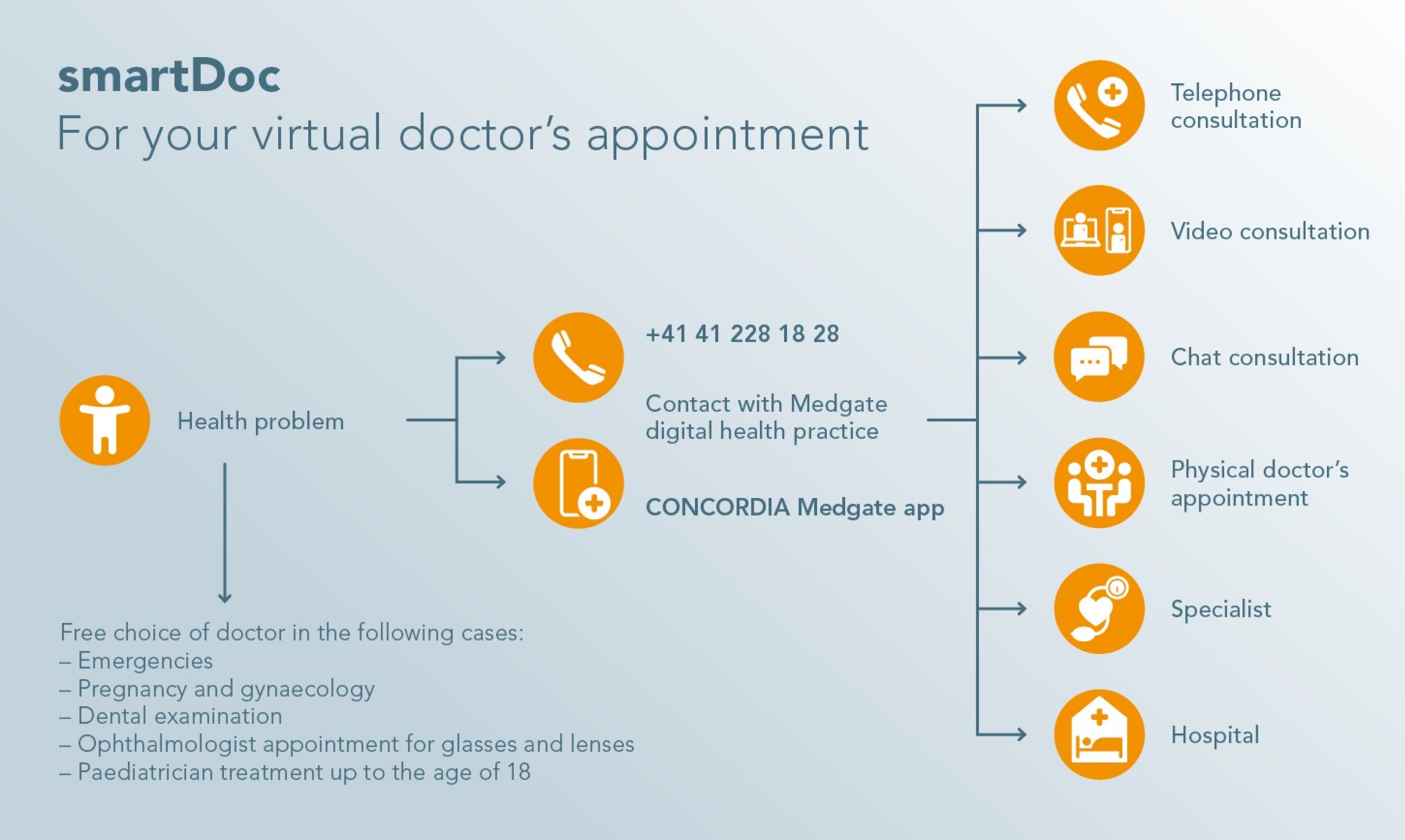 - Point of contact: insured persons with smartDoc insurance must always contact the Medgate digital health practice first when they have health concerns – either by phone on +41 41 228 18 28 or via the CONCORDIA Medgate app.