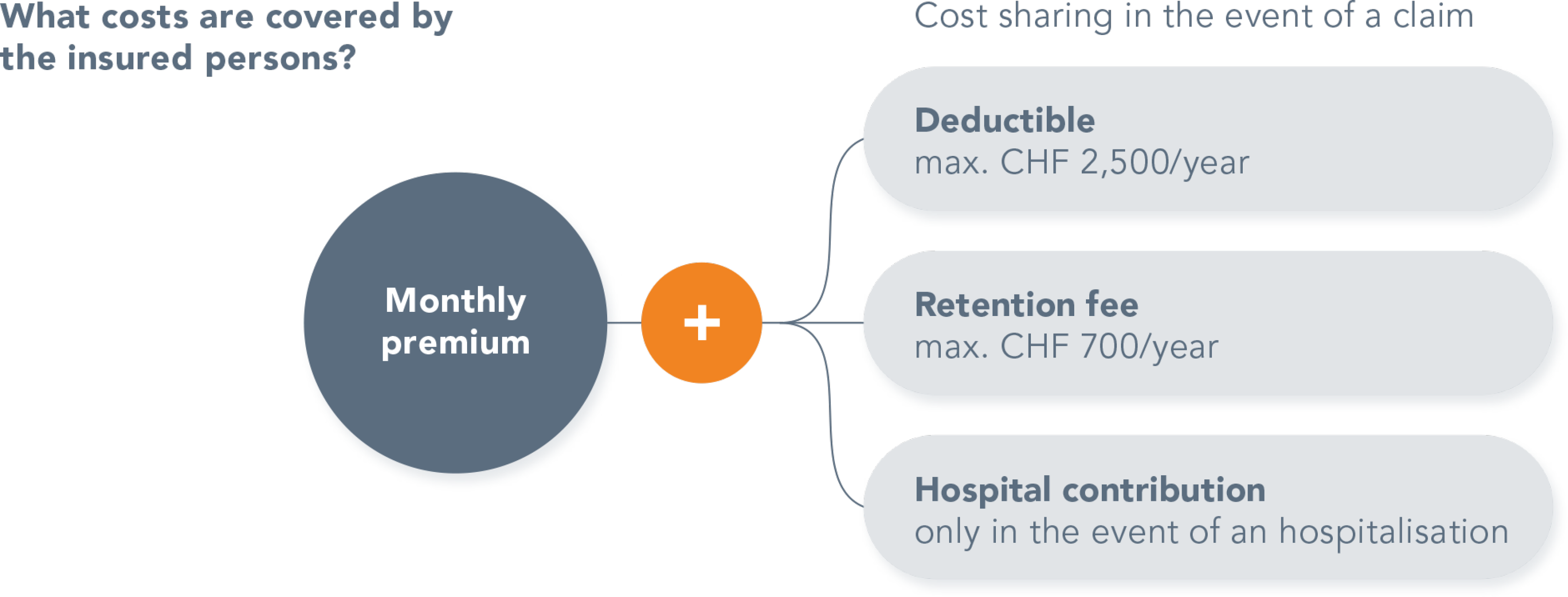 Retention fee: If the medical costs exceed the chosen deductible during the course of the calendar year, the health insurer will cover 90 % of the remaining costs. 10 % must be borne by the insured person as a retention fee. For select medications, this fee is 40 %. The retention fee is capped per year at a maximum of CHF 350 for insured persons up to 18 years of age and at a maximum of CHF 700 afterwards.