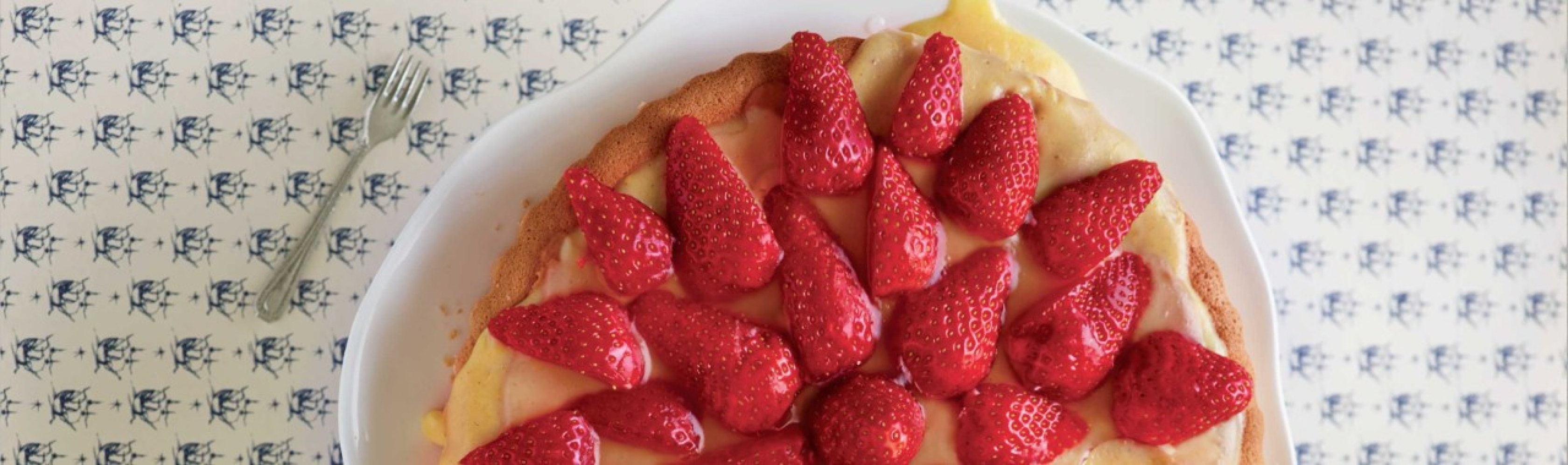 - Garniture fraises : Laver les fraises, les équeuter et les couper en quatre. Disposer les fraises sur la crème vanille. Optionnel: Préparer le nappage en délayant le contenu du sachet dans 250 ml d’eau froide et porter à ébullition. Répartir le nappage sur les fraises. Bon appétit !