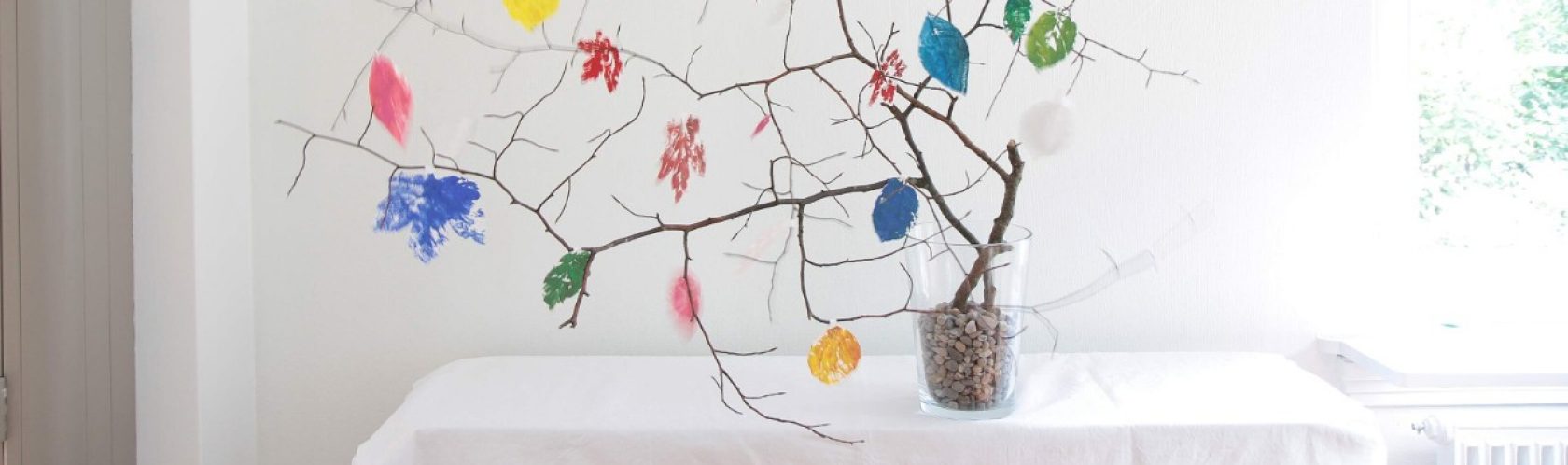 - Tu peux aussi remplacer les feuilles en papier par de vraies feuilles. Pour cela, il suffit de les laisser sécher, de les peindre et de les accrocher à ton arbre.