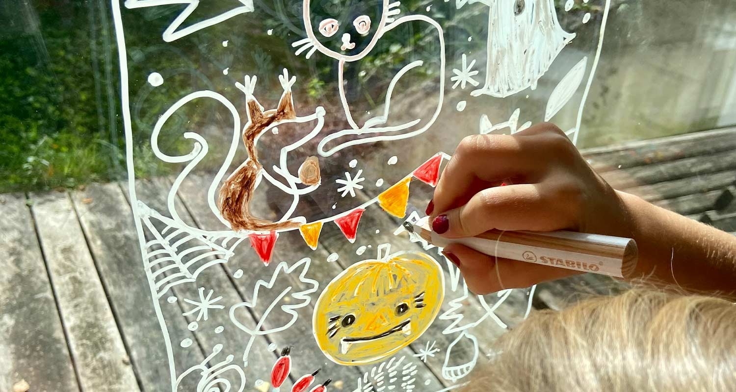 Des feutres pour vitre, comme par exemple des marqueurs craies (un blanc très couvrant, facile à effacer) ou les Chalky Finish Marker à base d’eau, résistant à la pluie (un peu moins blancs, ne tachent pas, s’effacent en un coup de chiffon) ou les STABILO Woody 3 en (couleurs moins vives, ne tachent pas, idéals pour les enfants, s’effacent avec du savon et une éponge)