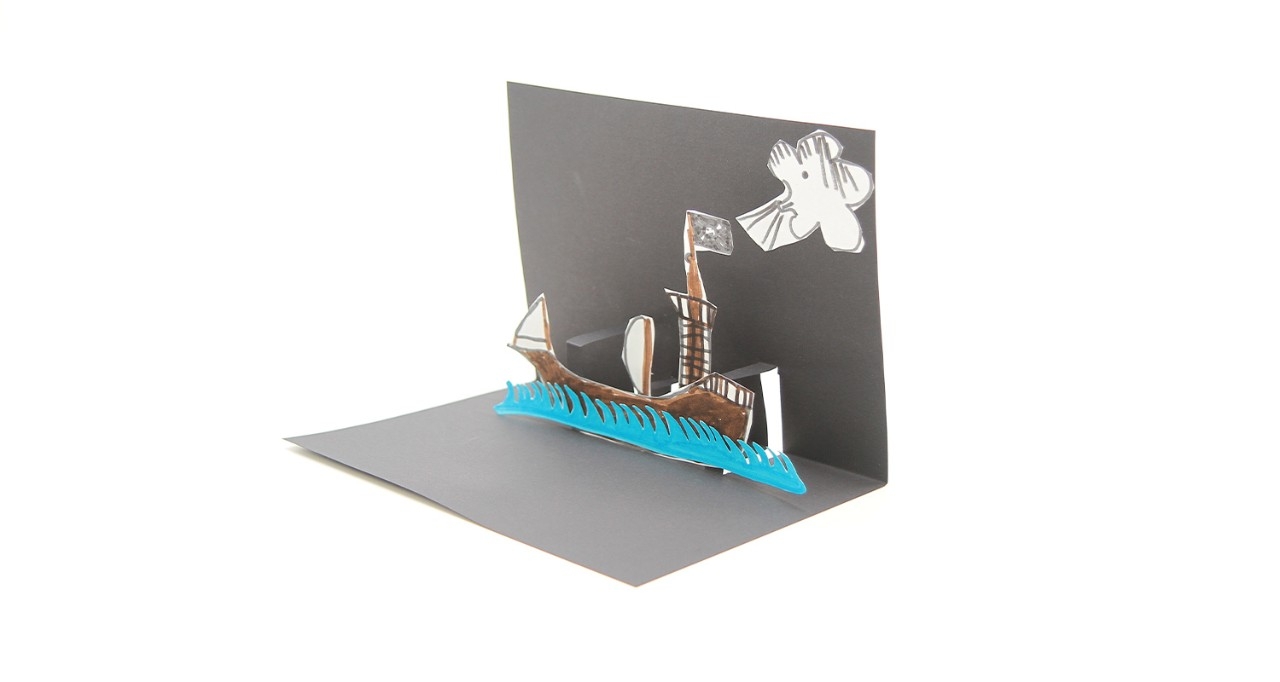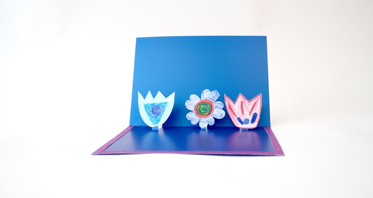 5. Une fois la carte ouverte, les bandelettes pliées vers l’intérieur forment des supports qui la maintiennent en position ouverte. Coller les motifs découpés sur les supports et sur la carte. Pour terminer, tu peux écrire ton message et laisser libre cours à ton imagination pour finir de décorer la carte en collant d’autres images découpées, des morceaux de masking tape décoratif etc. Laisser sécher la carte ouverte.