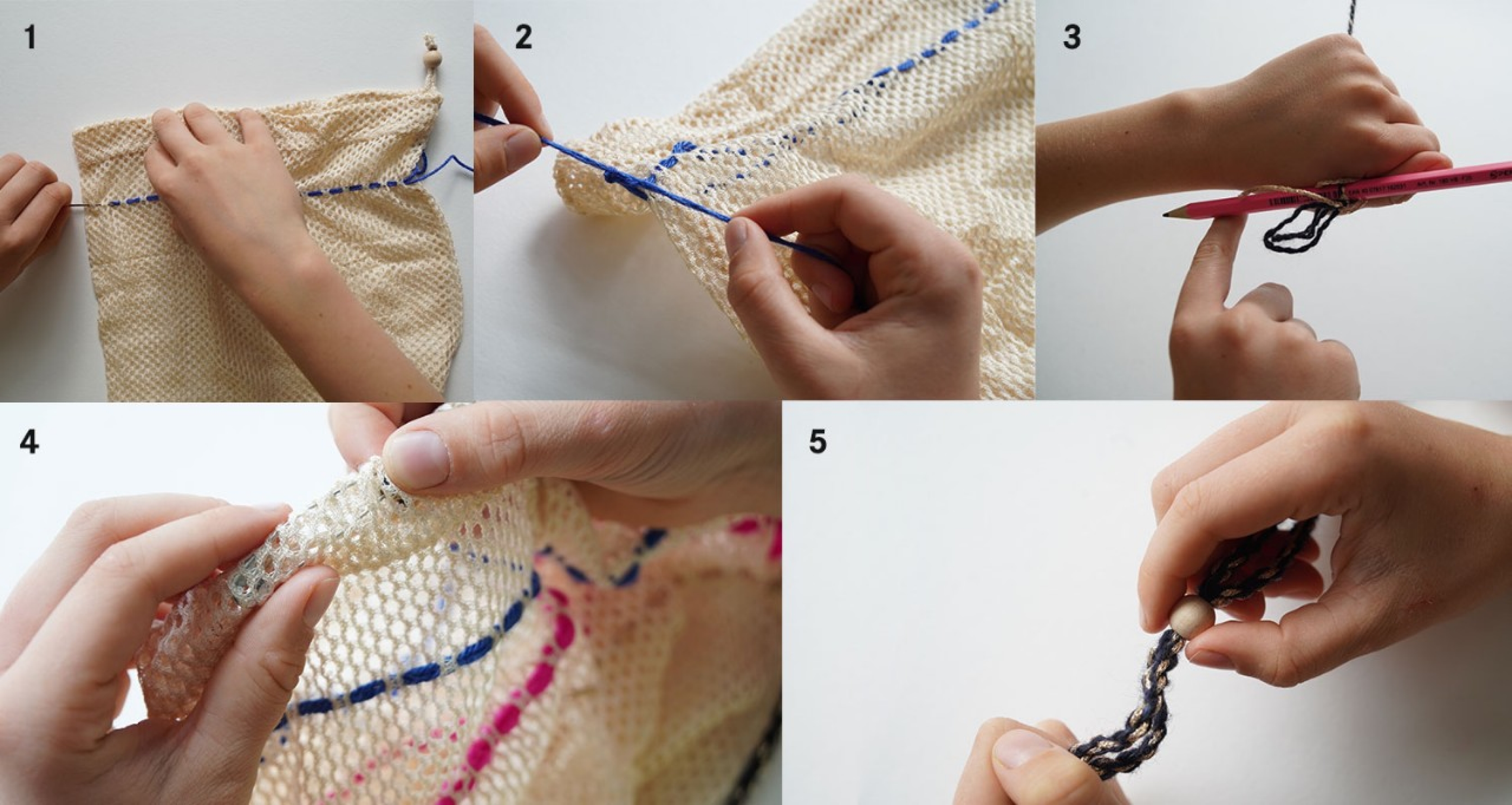 - Enfiler un brin de laine dans le chas d’une aiguille à repriser et le passer à travers les trous sur toute la largeur du sac.