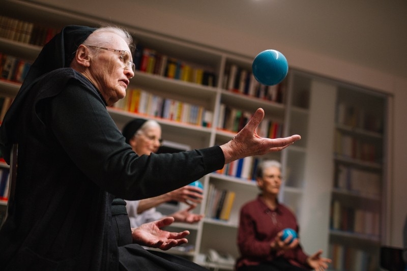 Sur la base d’un test physique réalisé avec les sœurs, une physiothérapeute de la Ligue contre le rhumatisme a élaboré des exercices adaptés, destinés à développer la force musculaire et à améliorer le sens de l’équilibre. Depuis, les religieuses ont absolument voulu maintenir ces séances d’entraînement et suivent désormais un cours de gymnastique une fois par semaine sous la direction de sœur Laetitia Pia.