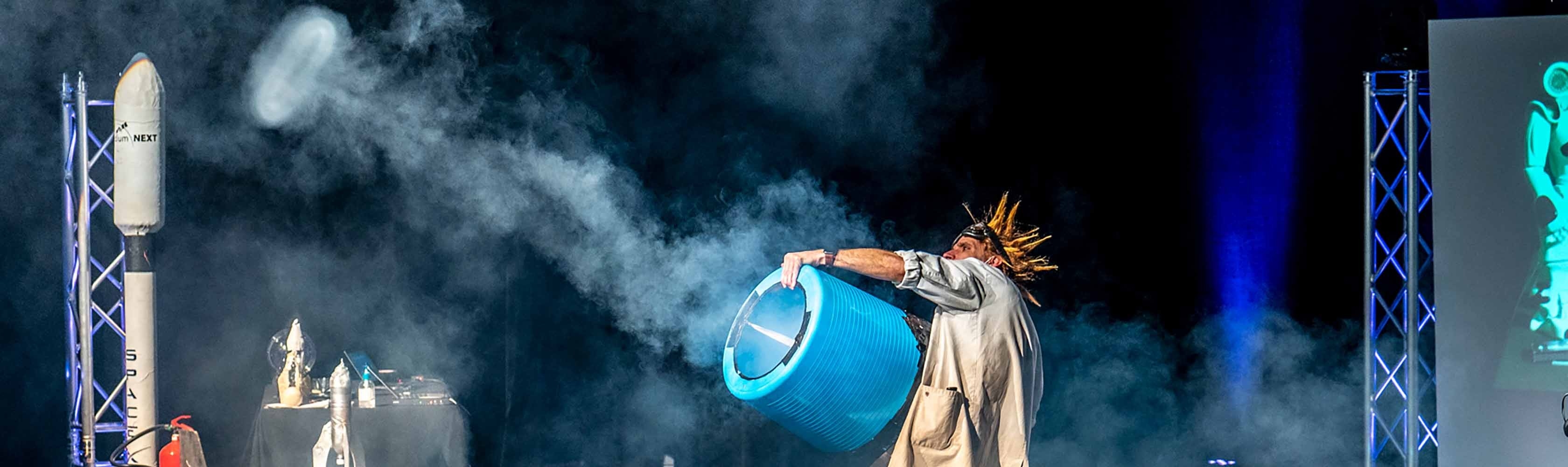 En Suisse alémanique, le spectacle sera animé par Raphael Oldani, alias Professor Bummbastic. Après avoir suivi un apprentissage de dessinateur en bâtiment, Raphael a vite troqué son crayon contre un cartable: il a suivi le séminaire de formation des enseignant·es à l’institut St. Michael à Zoug et enseigne aujourd’hui dans une école primaire. Parallèlement à son travail, Raphael a fait ses débuts au théâtre et a fréquenté la Swiss Musical Academy à Berne. Pendant plusieurs années, il a incarné un robot volant à travers l’espace dans la comédie musicale Space Dream et fait rire le public avec sa partenaire de scène au sein du duo comique Klischee. Ses spectacles scientifiques sont donc un mélange parfait entre ses différentes activités professionnelles.