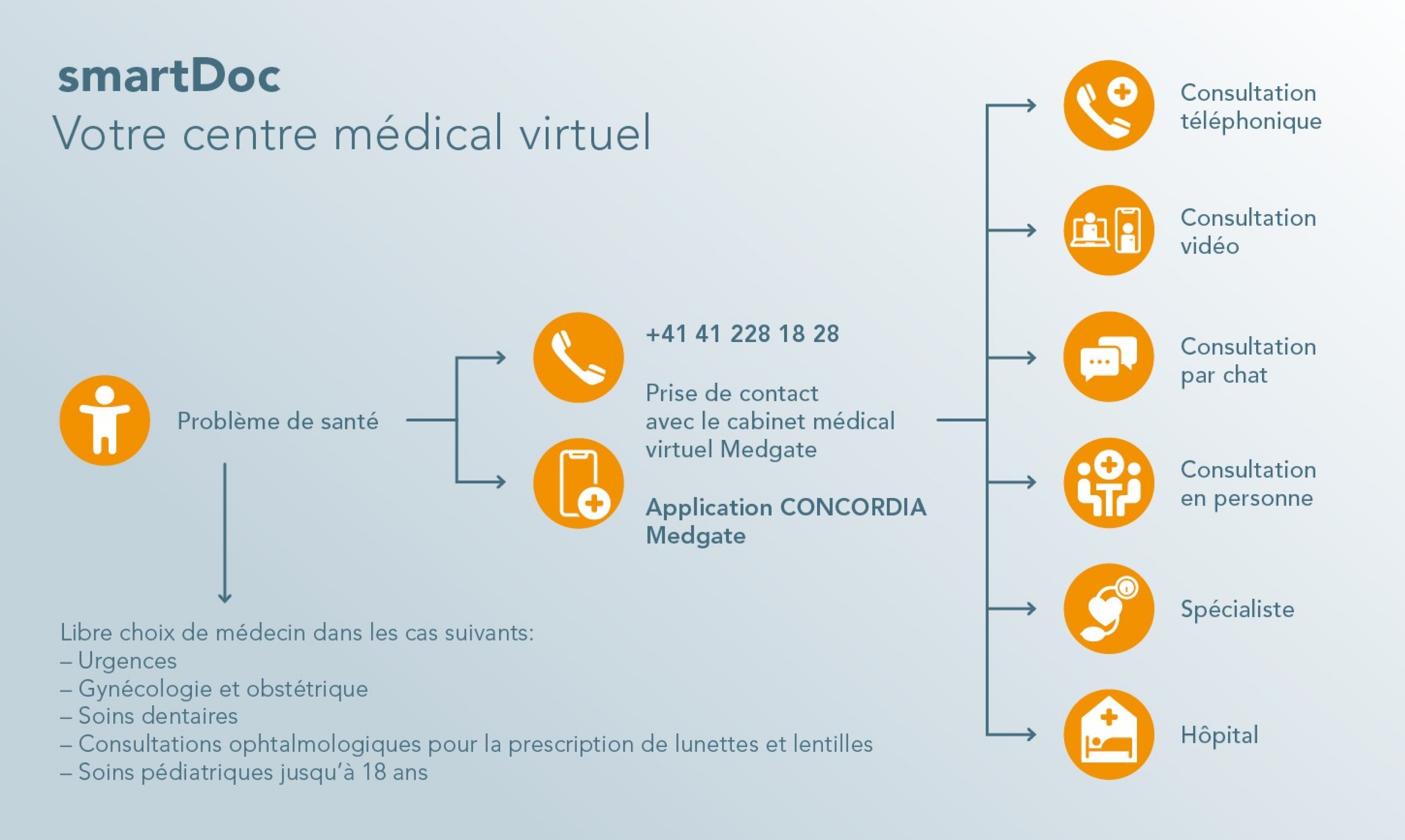 - Premier point de contact: les assuré·es smartDoc doivent dans tous les cas s’adresser au cabinet médical virtuel Medgate en cas de problèmes de santé, par téléphone au +41 41 228 18 28 ou au moyen de l’application CONCORDIA Medgate.