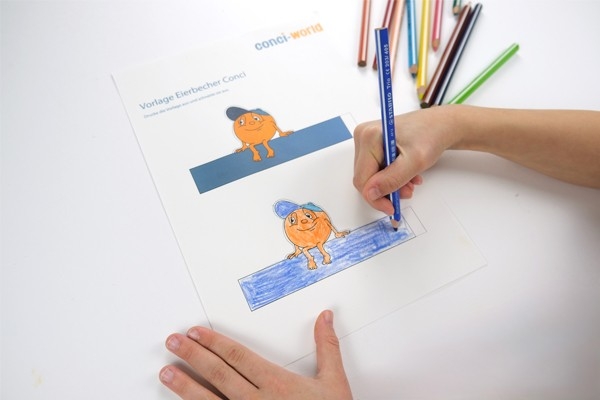 Kind schneidet Ostereierbecher-Vorlage aus 2. Ritaglia il modello lungo le linee.