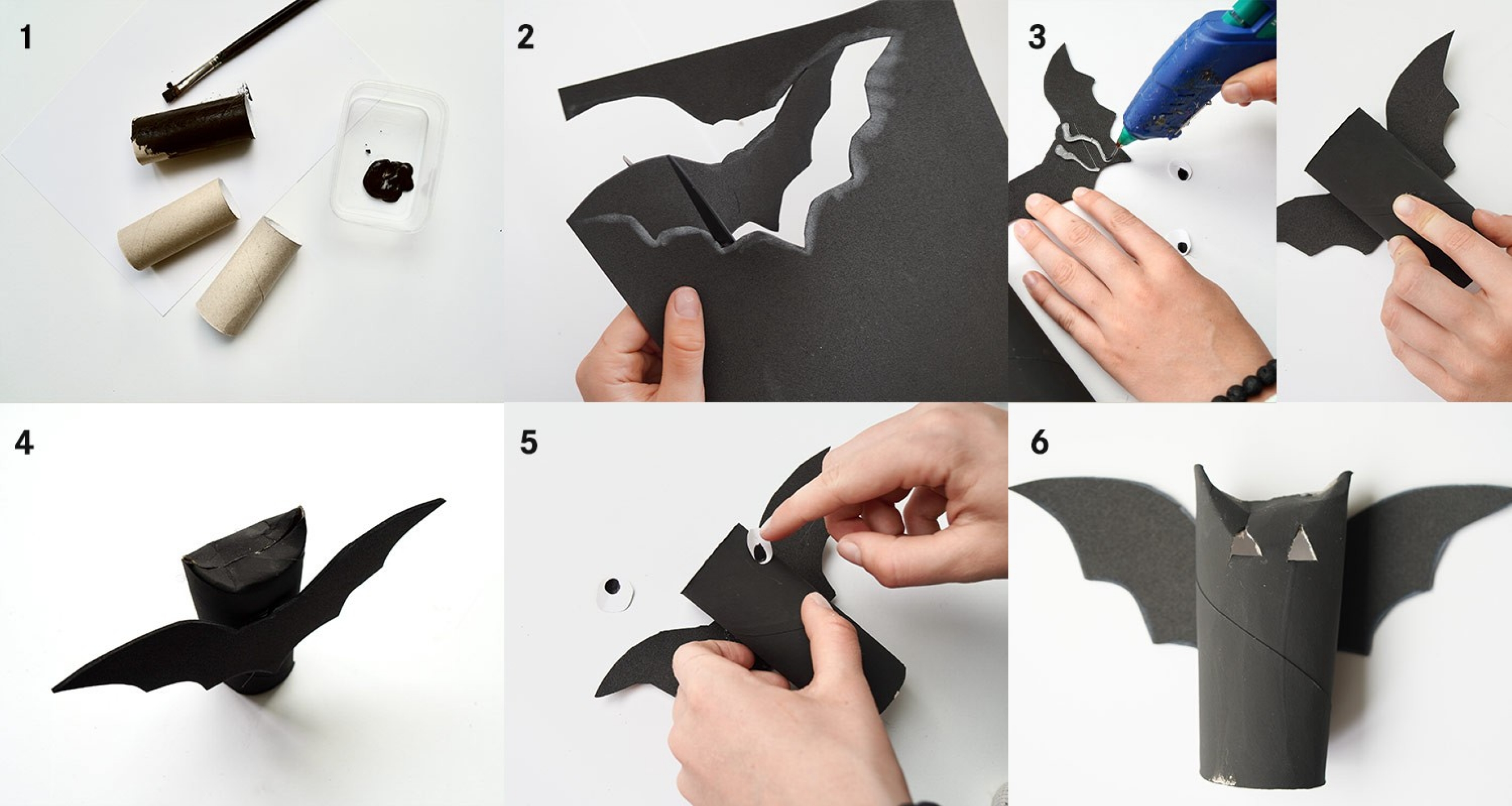 - Orecchie: piegare le estremità del rotolo di carta igienica in modo da formare le orecchie del pipistrello.