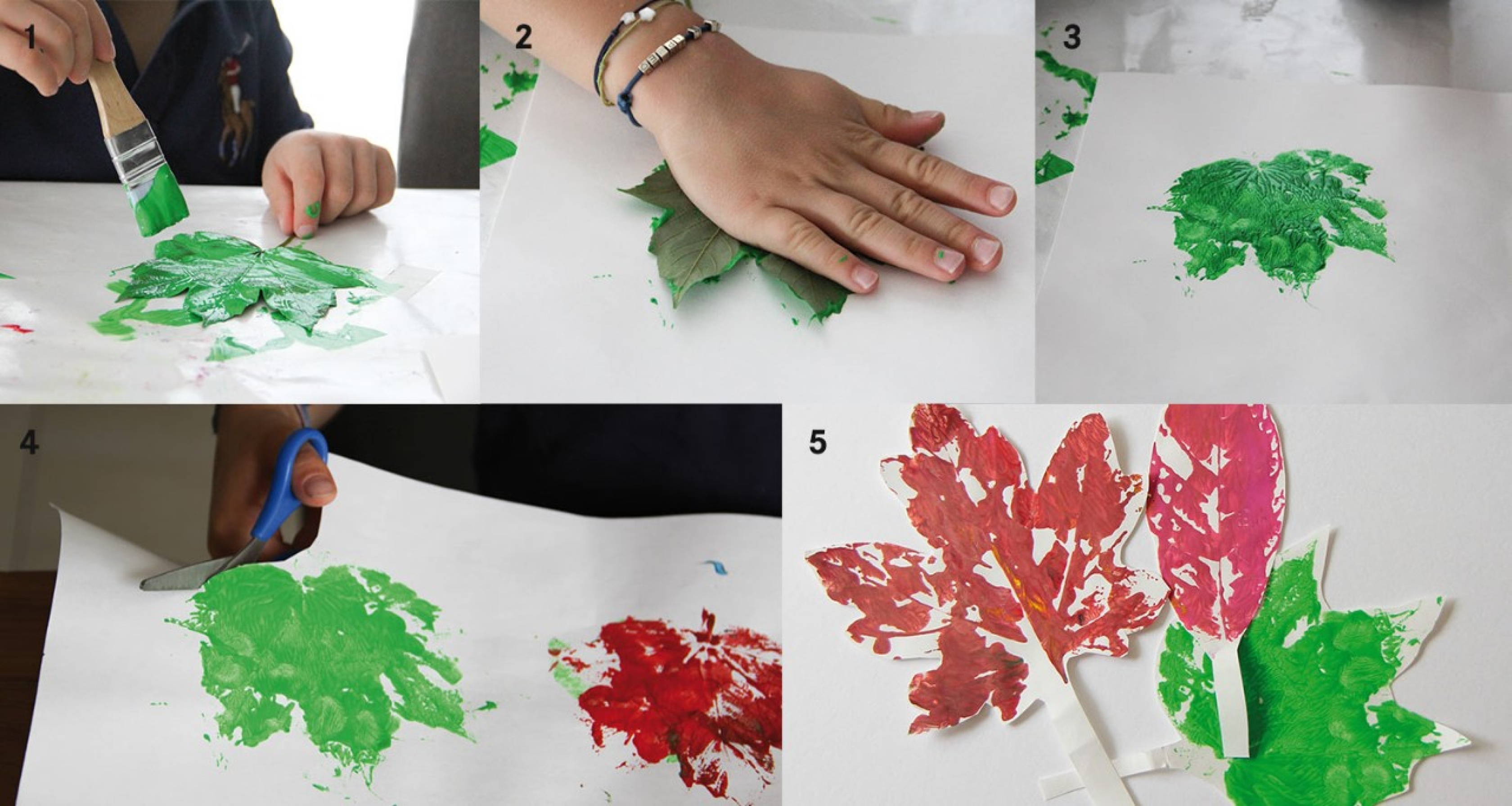 - Dipingete le foglie con colori autunnali e stampatele sulla carta.