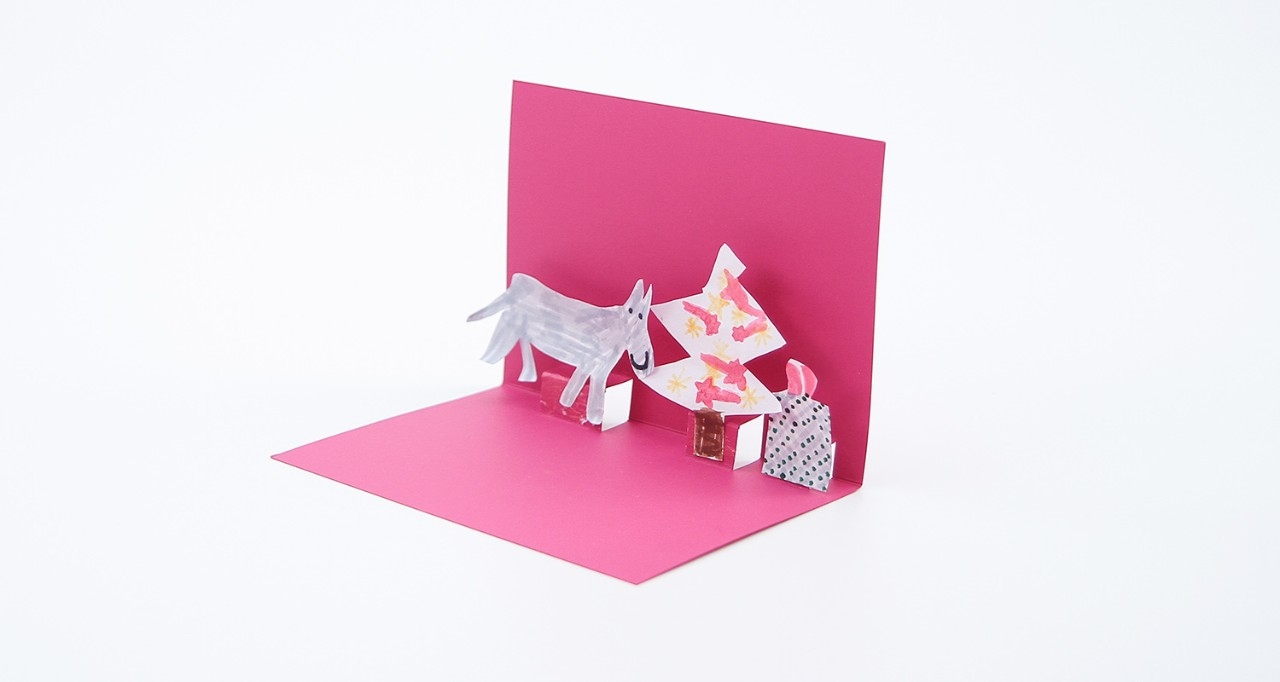 - A seconda delle dimensioni del biglietto pop-up: decidere se inserire un unico soggetto grande o più soggetti. Possibili contenuti: disegni, sagome ritagliate, soggetti stampati, immagini di riviste, lettere, numeri ecc. Fare attenzione che gli oggetti non siano troppo grandi altrimenti fuoriescono dal biglietto.