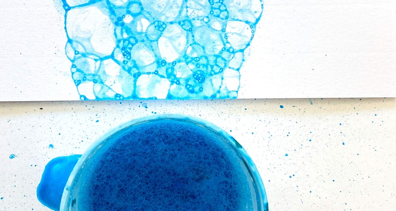 - Soffiare dentro il bicchiere con una cannuccia in modo da creare tante bolle. Piano piano, aiutandosi con la cannuccia, un cucchiaio o la mano, far uscire le bolle dal bicchiere e posarle sulla carta.