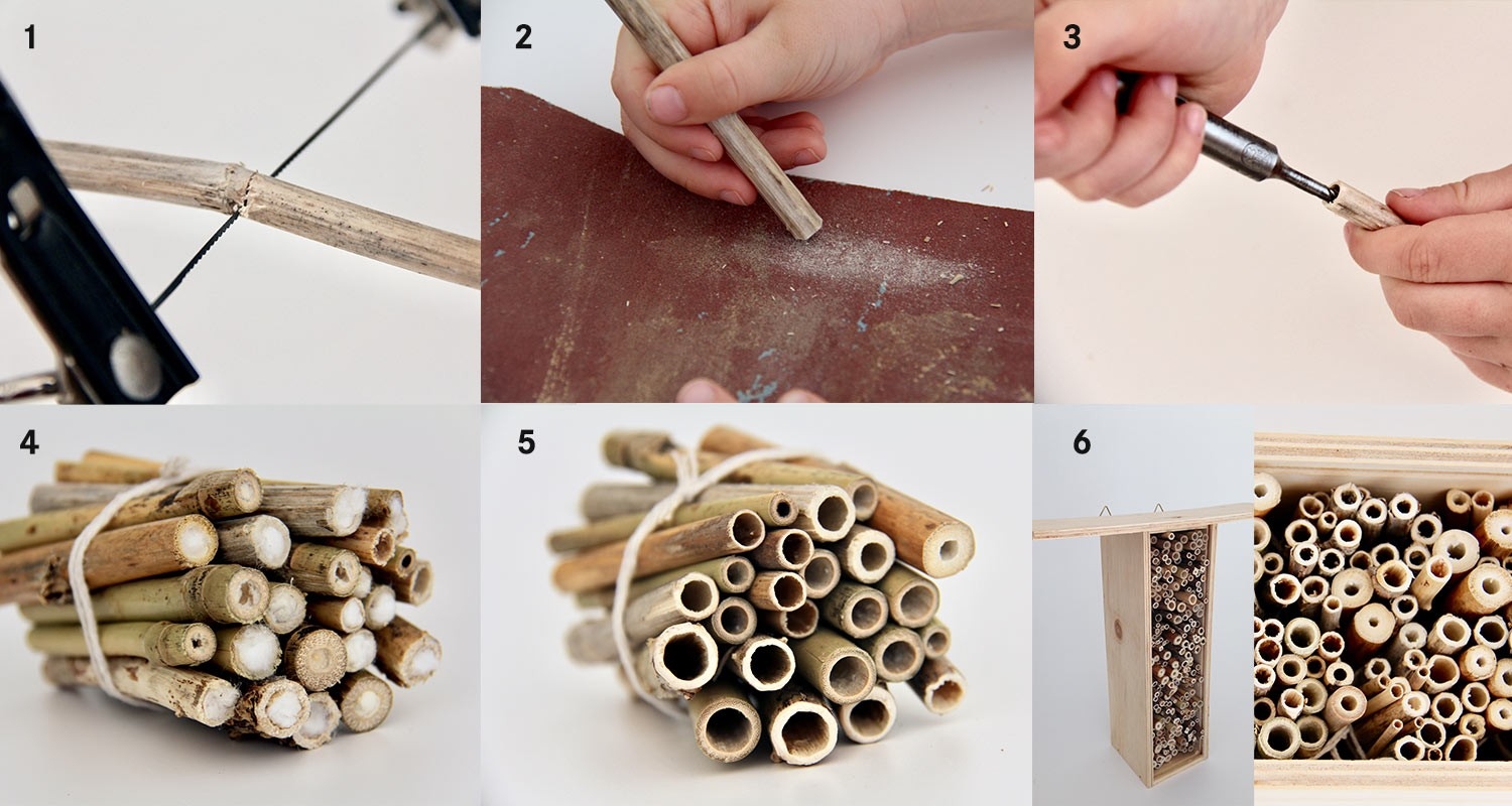 - Segare gli steli in modo da ottenere singoli tubicini di lunghezza inferiore a quella della cassetta di legno, così saranno riparati dalla pioggia. Le api selvatiche preferiscono gallerie del diametro di 3-6 mm, quindi queste dovranno essere presenti in numero maggiore. Inoltre i tubicini devono essere lunghi almeno 8 cm.
