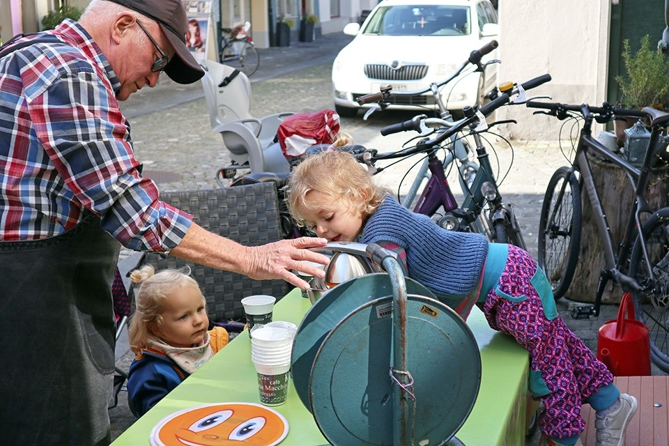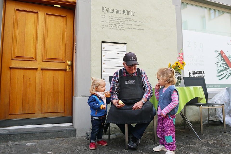Nella casa multi-generazione sulla Kluggasse la monotonia non esiste. Vivere, lavorare e godersi i frutti del proprio lavoro: è questo il credo della famiglia Elsener. I nonni giocano con i piccoli davanti al negozio. Mentre si concedono una pausa e distribuiscono spicchi di mele, nell’officina i macchinari continuano a girare.