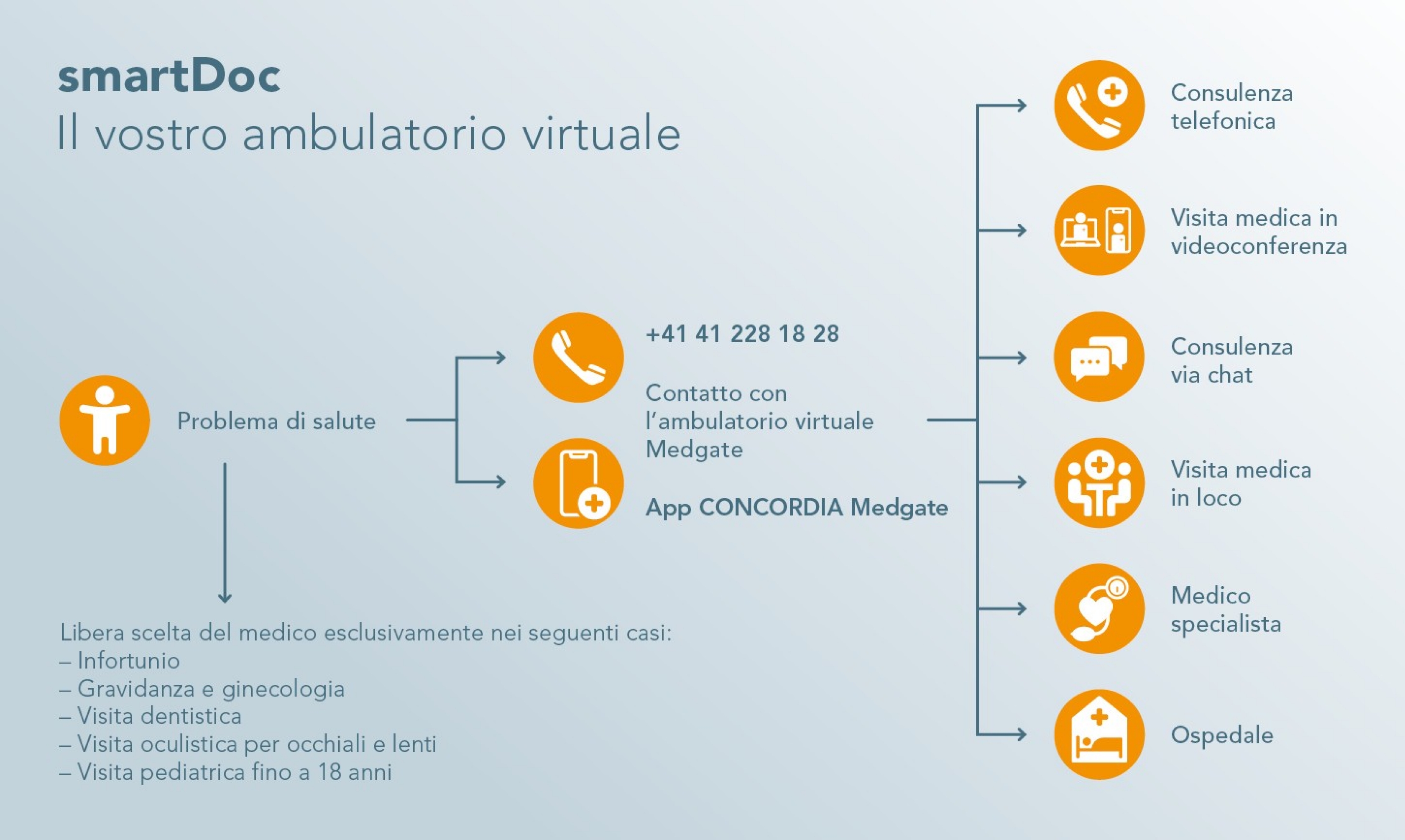 - Punto di contatto: per qualsiasi problema di salute le assicurate e gli assicurati smartDoc sono tenuti a contattare sempre in prima istanza l’ambulatorio virtuale Medgate – per telefono allo +41 41 228 18 28 o mediante l’app CONCORDIA Medgate.